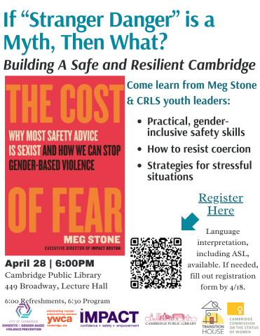 Meg Stone, author of The Cost of Fear, will offer practical, gender-inclusive strategies for learning safety skills important for resisting coercion, intimidation, and violence. Avoiding violence is about developing skills, not following rules. Women receive advice like "don't wear a ponytail" or "don't shop alone." These tips lack evidence and come from male authorities who avoid questions.