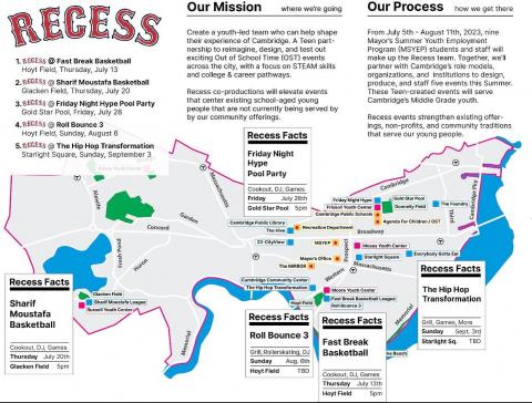 RECESS is a citywide collaboration aimed at creating a vibrant middle school activity hub, brought to you by the talented teens from the Mayor's Summer Youth Employment Program. This summer's version of RECESS is teaming up with various events across Cambridge to host community-based "pop-ups" tailored to young people entering grade 6, 7, or 8 for the upcoming school year.