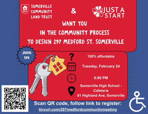 Swing by to learn more about the early stages of Somerville Community Land Trust and Just A Start's process to develop new, affordable homes at 297 Medford Street. We'll have interactive stations for community members to: