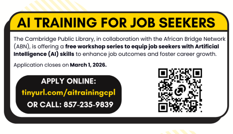 The Cambridge Public Library and the African Bridge Network (ABN) are offering an AI training for people looking for jobs.