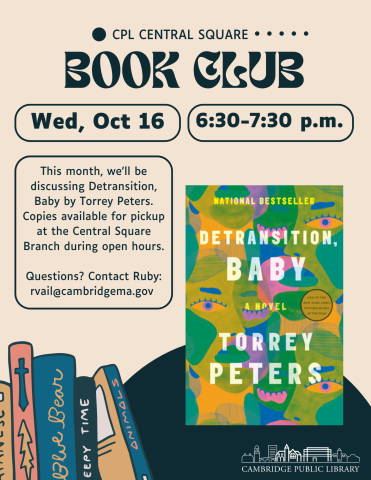 This month, we're reading Detransition Baby by Torrey Peters. Copies are available for pickup at the Branch.