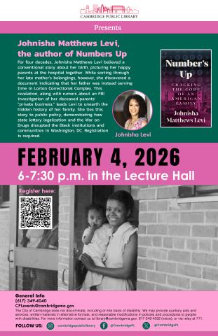 For four decades, Johnisha Matthews Levi believed a conventional story about her birth, picturing her happy parents at the hospital together. While sorting through her late mother's belongings, however, she discovered a document indicating that her father was instead serving time in Lorton Correctional Complex. This revelation, along with rumors about an FBI investigation of her deceased parents' "private business," leads Levi to unearth the hidden history of her family. She ties this story to public policy, demonstrating how state lottery legalization and the War on Drugs disrupted the Black institutions and communities in Washington, DC. Registration is required.