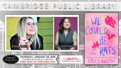 Harvard Book Store and the Cambridge Public Library welcome Emily Austin—bestselling author of Everyone in This Room Will Someday Be Dead, Interesting Facts About Space, and the poetry collection Gay Girl Prayers—for a discussion of her new novel We Could Be Rats, an unforgettable story of two sisters finding their way back to each other. She will be joined in conversation by Kimm Topping—Lecturer on Education at the Harvard Graduate School of Education and author of Generation Queer.