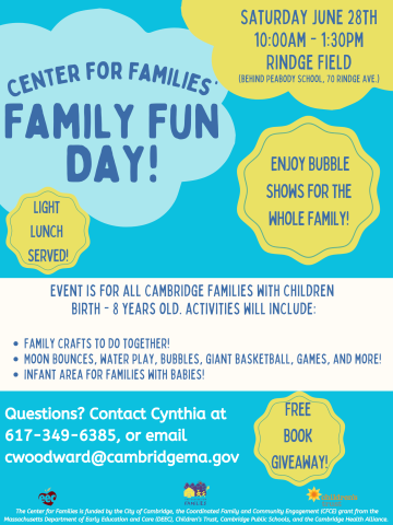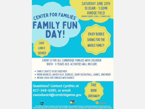 Free family event is for all Cambridge families with children birth - 8 years old.