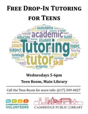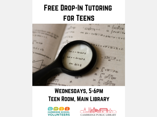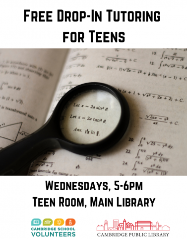 Have a question before an exam? Tutors are available to help you! Cambridge School Volunteers and the Library are pleased to offer tutoring services in the Teen Room. No registration required. Stop by the Teen Room or call 617-349-4027 to learn more.