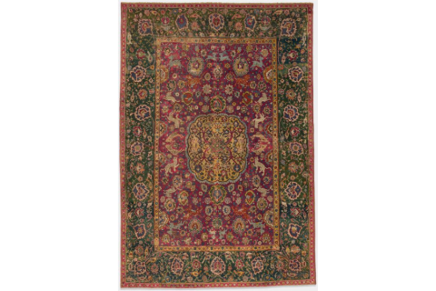 On view in the Islamic art gallery (2550) are a 16th-century Persian carpet, a selection of ceramic and metal sculptural objects from 13th- and 19th-century Iran, and contemporary glass birds by Turkish artist Felekşan Onar. The display in the South Asian art gallery (2590) includes a devotional painting showing animal mounts of Hindu deities, a textile featuring hybrid creatures from Hindu mythology, and a Gujarati embroidery with rainbow-colored birds.
