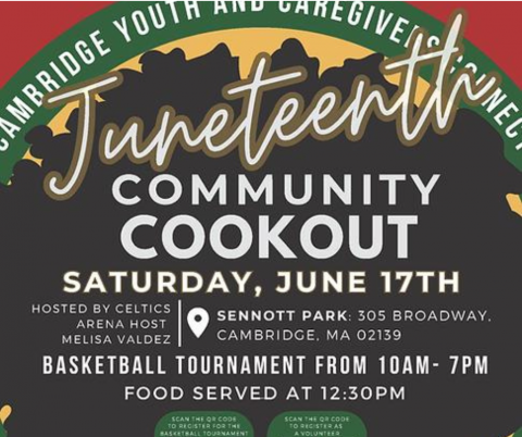 Community Cookout and Basketball Tournament on June 17th at Sennott Park will be hosted by Celtics Arena Host Melisa Valdez, in parntership with Cambridge Youth and Caregivers Connect, FRiday Night Hype, and a number of other community sponsors, vendors, and supporting organizations.