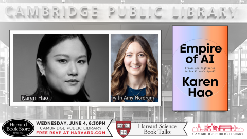 Harvard Book Store, the Harvard University Division of Science, the Harvard Library, and the Cambridge Public Library welcome Karen Hao—award-winning journalist and contributing writer for The Atlantic—for a discussion of her new book, Empire of AI: Dreams and Nightmares in Sam Altman's OpenAI. She will be joined in conversation by Amy Nordrum—an executive editor at MIT Technology Review. Registration is required.