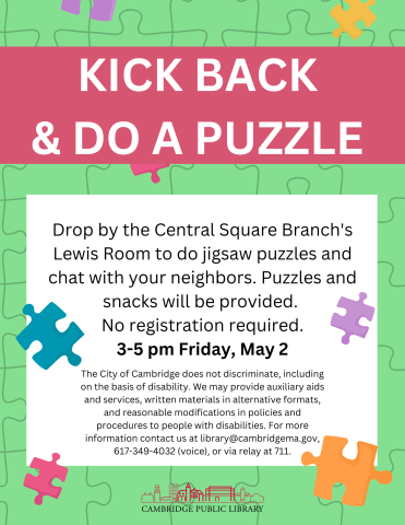 Drop by the Central Square Branch's Lewis Room to do jigsaw puzzles and chat with your neighbors.