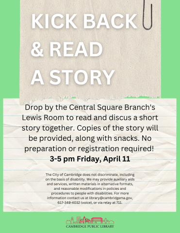 Drop by the Central Square Branch's Lewis Room to read and discus a short story together. Copies of the story will be provided, along with snacks. No preparation or registration required!