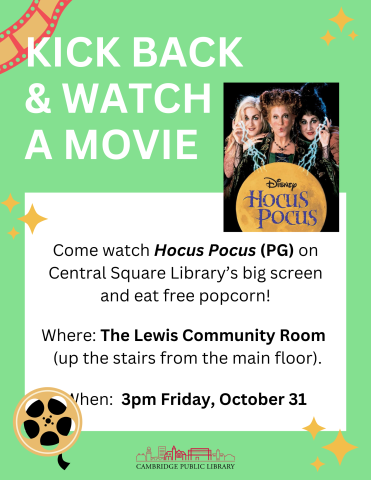 Join us for a special Halloween screening of Hocus Pocus (PG) on Central Square Library's big screen and eat free popcorn! No registration required.