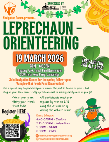 Join us this March 19, 2026 at Fresh Pond Reservation for an evening of orienteering fun! Teams and pairs will travel the park, looking for checkpoints using a special map. Stay on your toes, tricky leprechauns will be moving checkpoints around as you try to find them - good luck!