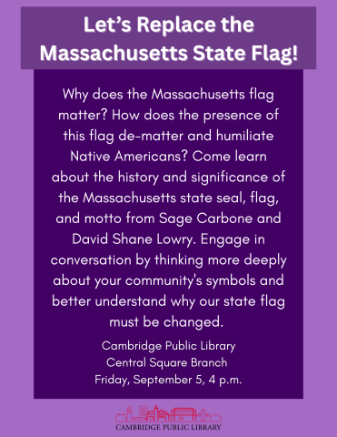 How does the presence of this flag de-matter and humiliate Native Americans? Come learn about the history and significance of the Massachusetts state seal, flag, and motto from Sage Carbone and David Shane Lowry.. Engage in conversation by thinking more deeply about your community's symbols and better understand why our state flag must be changed.