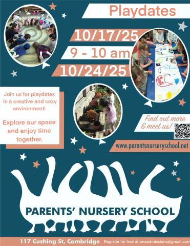 Looking for something fun to do with your toddler or preschooler? Come visit us at Parents' Nursery School for an hour-long playdate! We'll play outside in our yard from 9-10am on October 17 and October 24.