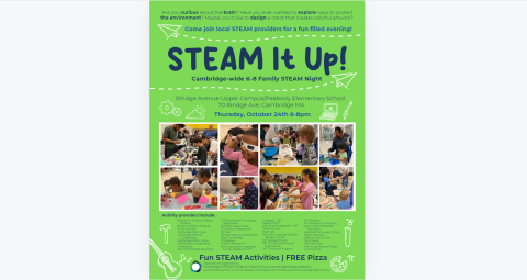 Come on by this city-wide K-8 family STEAM night sponsored by the Cambridge STEAM Initiative. There are over 25 hands on activities for all ages to engage in!