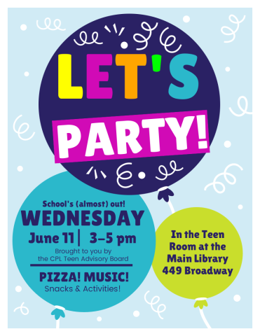 School's almost out, so let's celebrate! Join us for pizza and crafts and relax before exams. Bring your friends. And of course - it's free! Presented by the CPL Teen Advisory Board.
