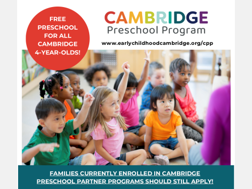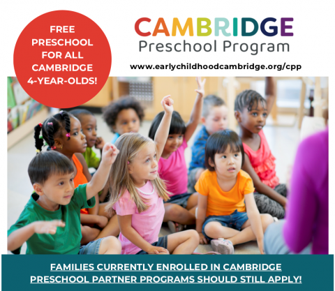 The Cambridge Preschool Program (CPP), also known as universal preschool, will provide FREE preschool to Cambridge 4-year-olds and some 3-year-olds beginning in September each year. CPP provides high quality preschool, and families can choose from a variety of Cambridge-based preschool programs.