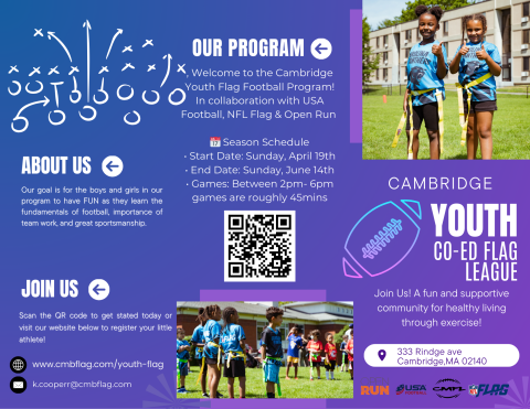 Cambridge Youth Flag Football League is for boys and girls between the ages of 3-17 and is designed to teach players of all abilities new skills and training regiments.