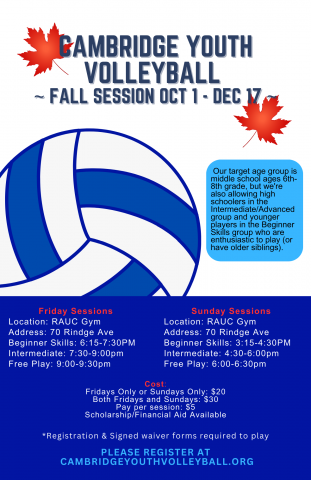 We host a fall volleyball season aimed at including students from grades 6-8 (some exceptions can be made for high school students in advanced groups who are eager to learn how to play).