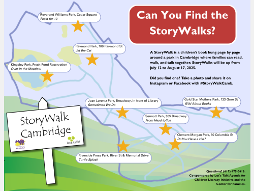 A StoryWalk is a children's book hung page by page around a park in Cambridge where families can read, walk, and talk together. Find the 8 StoryWalks in parks around the city from July 12-August 17, 2025. Did you find one? Check it out and then take a photo and share it on Instagram and Facebook with #StoryWalkCamb.